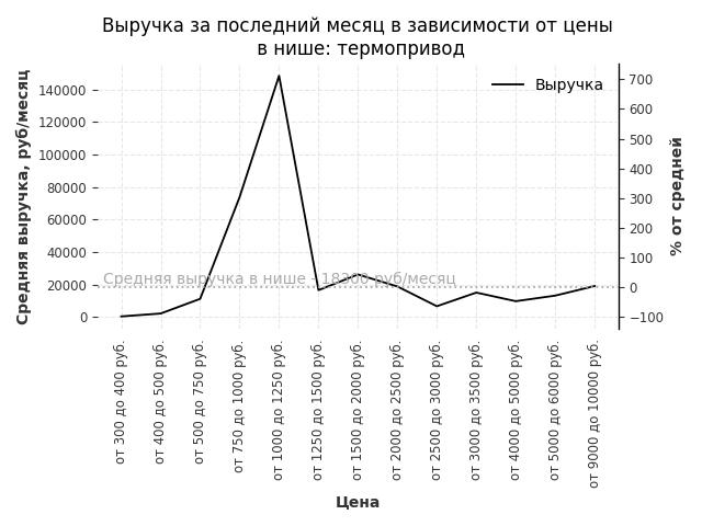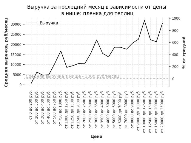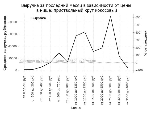 Средняя выручка в нише - 3000 руб./месяц. Максимальная выручка 31900 руб./месяц, на 960% больше среднего в нише, была при цене от 10000 до 12500 руб. руб.