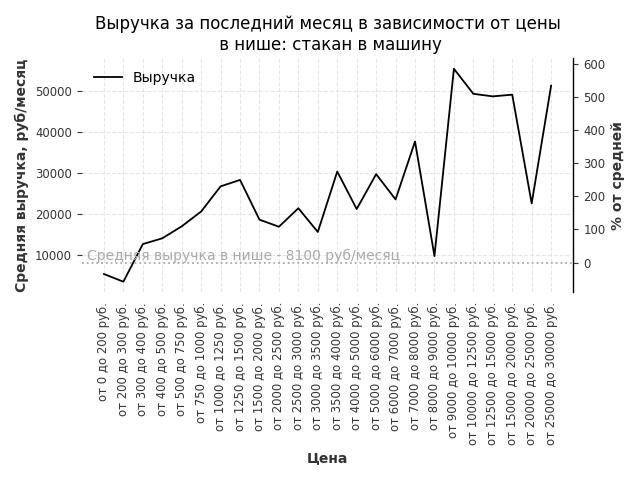 Средняя выручка в нише - 8100 руб./месяц. Максимальная выручка 55500 руб./месяц, на 590% больше среднего в нише, была при цене от 9000 до 10000 руб. руб.
