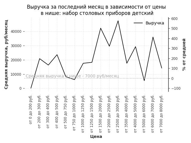 Средняя выручка в нише - 7000 руб./месяц. Максимальная выручка 47300 руб./месяц, на 580% больше среднего в нише, была при цене от 2500 до 3000 руб. руб.