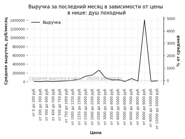 Средняя выручка в нише - 28200 руб./месяц. Максимальная выручка 1405100 руб./месяц, на 4880% больше среднего в нише, была при цене от 8000 до 9000 руб. руб.