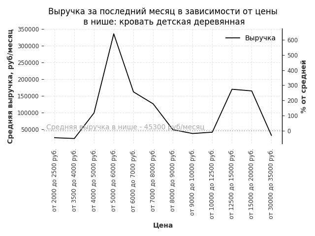 Средняя выручка в нише - 45300 руб./месяц. Максимальная выручка 334900 руб./месяц, на 640% больше среднего в нише, была при цене от 5000 до 6000 руб. руб.