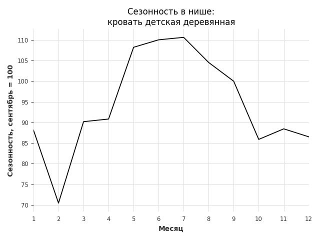 Сезонность в нише слабая. Пик сезонных продаж в нише - июль. В ближайшие месяцы можно ожидать сезонного спада продаж до 15%.