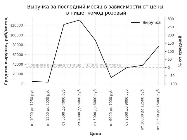 Средняя выручка в нише - 33300 руб./месяц. Максимальная выручка 130600 руб./месяц, на 290% больше среднего в нише, была при цене от 4000 до 5000 руб. руб.