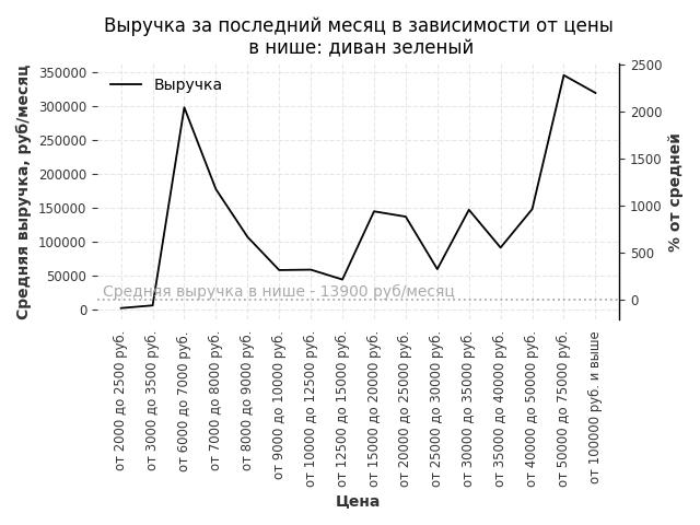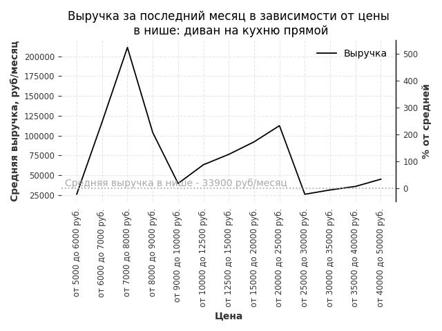 Средняя выручка в нише - 33900 руб./месяц. Максимальная выручка 211200 руб./месяц, на 520% больше среднего в нише, была при цене от 7000 до 8000 руб. руб.