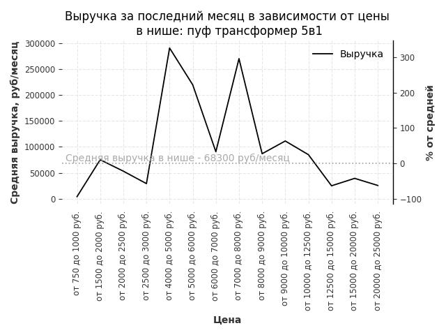 Средняя выручка в нише - 68300 руб./месяц. Максимальная выручка 290700 руб./месяц, на 330% больше среднего в нише, была при цене от 4000 до 5000 руб. руб.