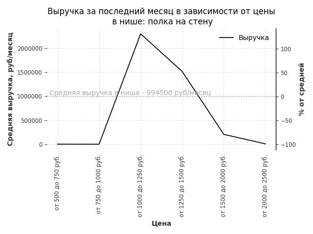 Средняя выручка в нише - 994500 руб./месяц. Максимальная выручка 2298400 руб./месяц, на 130% больше среднего в нише, была при цене от 1000 до 1250 руб. руб.