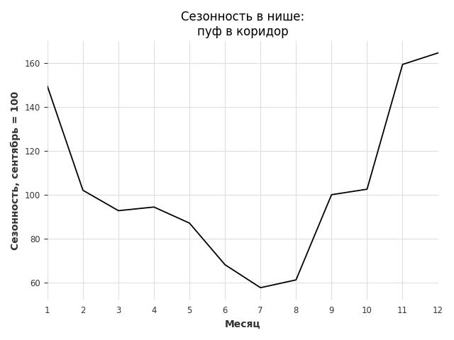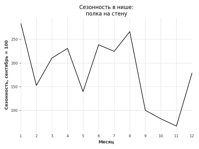 Сезонность в нише слабая. Пик сезонных продаж в нише - сентябрь. В ближайшие месяцы можно ожидать сезонного спада продаж до 23%.