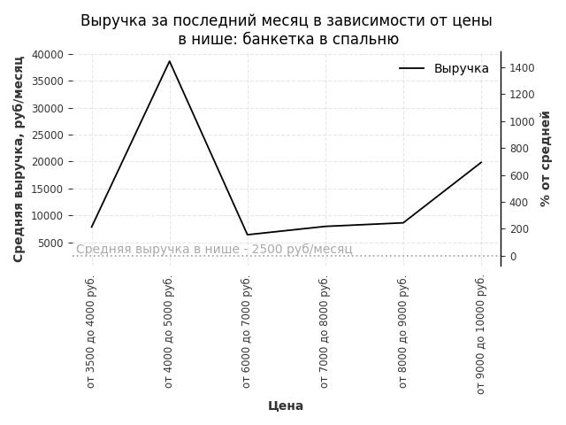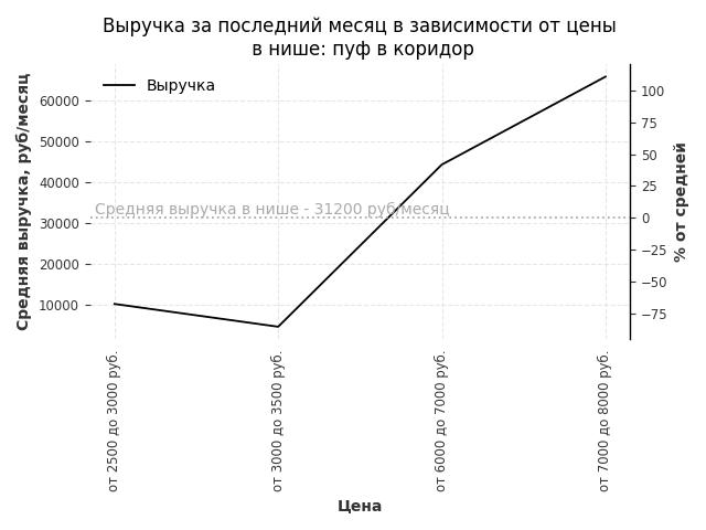 Средняя выручка в нише - 31200 руб./месяц. Максимальная выручка 65700 руб./месяц, на 110% больше среднего в нише, была при цене от 7000 до 8000 руб. руб.