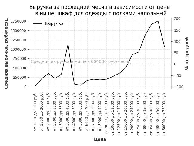 Средняя выручка в нише - 604000 руб./месяц. Максимальная выручка 1752400 руб./месяц, на 190% больше среднего в нише, была при цене от 40000 до 50000 руб. руб.