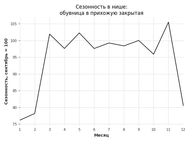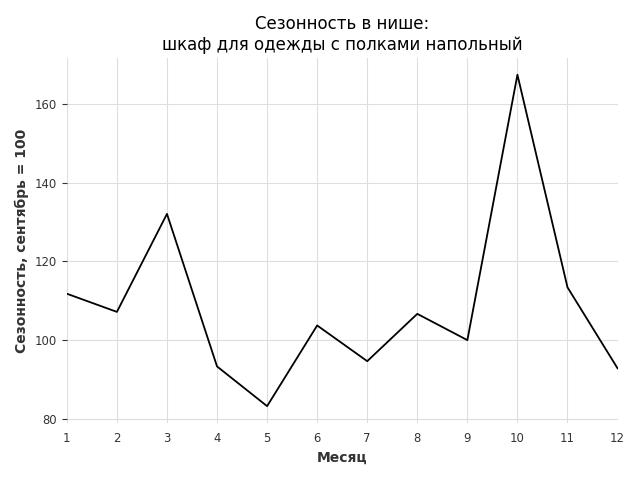 Сезонность в нише средняя. Пик сезонных продаж в нише - октябрь. В ближайшие месяцы можно ожидать сезонного роста продаж до 67%.