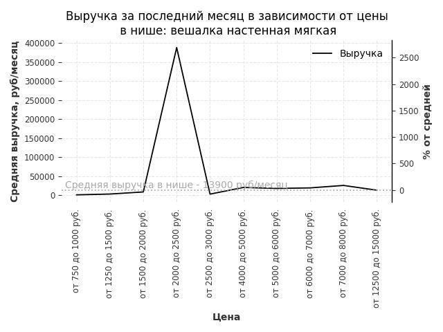 Средняя выручка в нише - 13900 руб./месяц. Максимальная выручка 387800 руб./месяц, на 2690% больше среднего в нише, была при цене от 2000 до 2500 руб. руб.