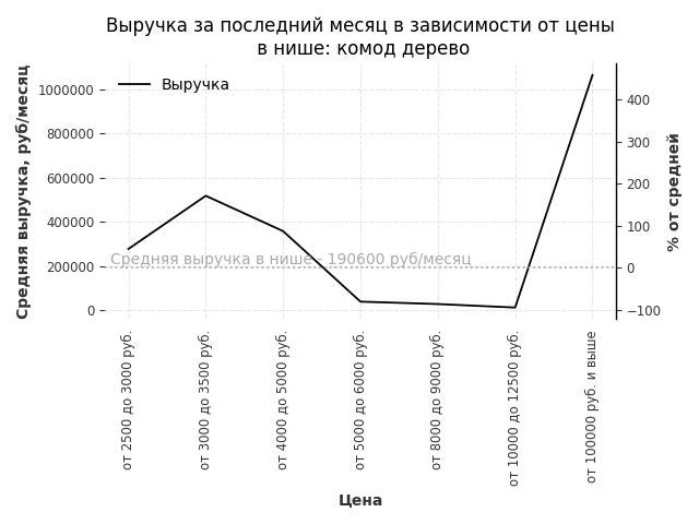 Средняя выручка в нише - 190600 руб./месяц. Максимальная выручка 1065400 руб./месяц, на 460% больше среднего в нише, была при цене от 100000 руб. и выше руб.