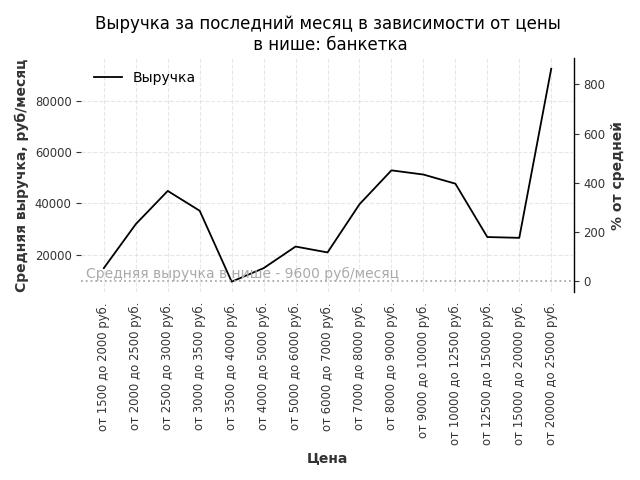Средняя выручка в нише - 9600 руб./месяц. Максимальная выручка 92400 руб./месяц, на 860% больше среднего в нише, была при цене от 20000 до 25000 руб. руб.