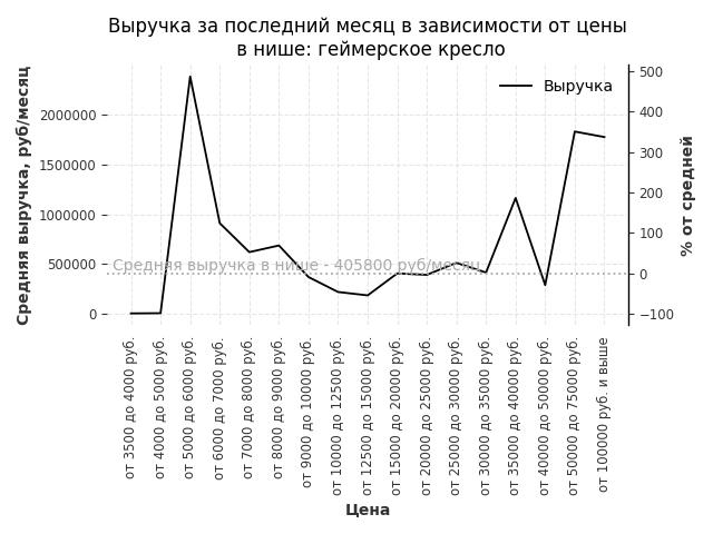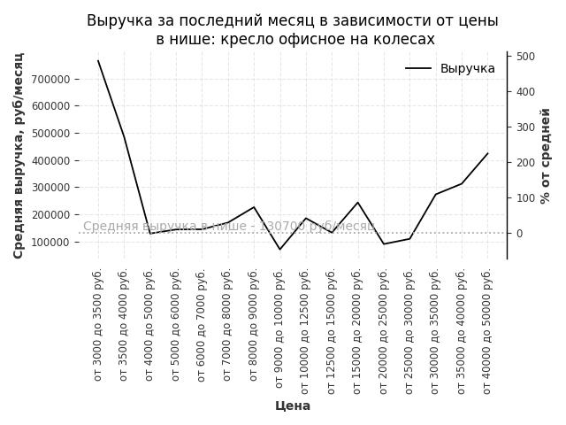 Средняя выручка в нише - 130700 руб./месяц. Максимальная выручка 764800 руб./месяц, на 490% больше среднего в нише, была при цене от 3000 до 3500 руб. руб.