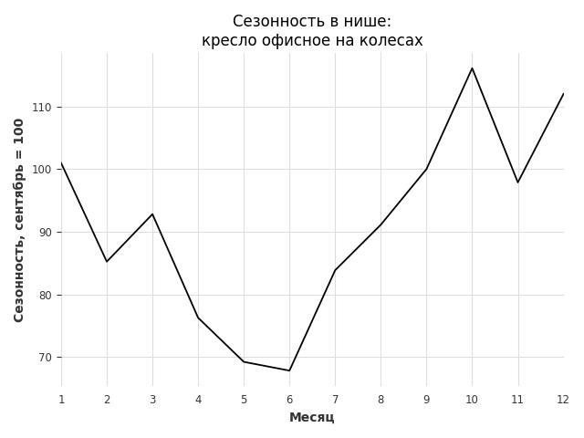 Сезонность в нише средняя. Пик сезонных продаж в нише - декабрь. В ближайшие месяцы можно ожидать сезонного роста продаж до 85%.