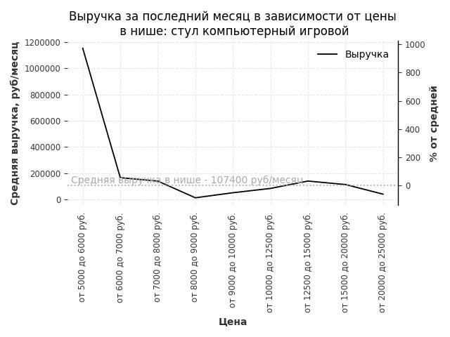 Средняя выручка в нише - 107400 руб./месяц. Максимальная выручка 1151800 руб./месяц, на 970% больше среднего в нише, была при цене от 5000 до 6000 руб. руб.