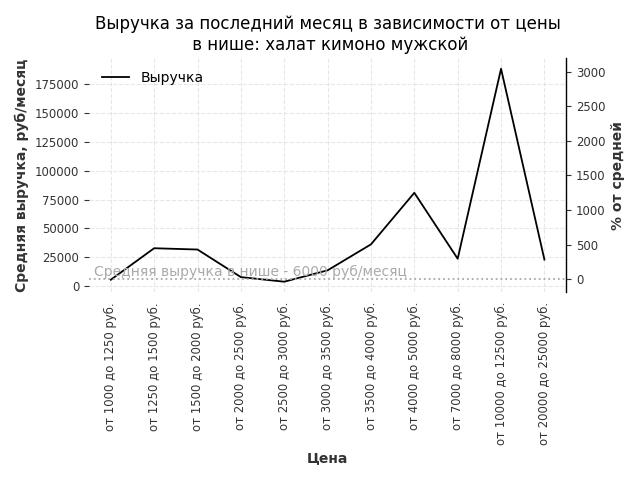Средняя выручка в нише - 6000 руб./месяц. Максимальная выручка 188600 руб./месяц, на 3040% больше среднего в нише, была при цене от 10000 до 12500 руб. руб.