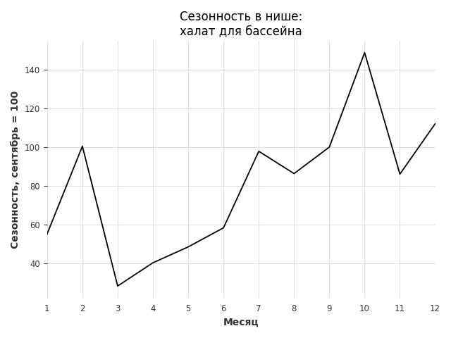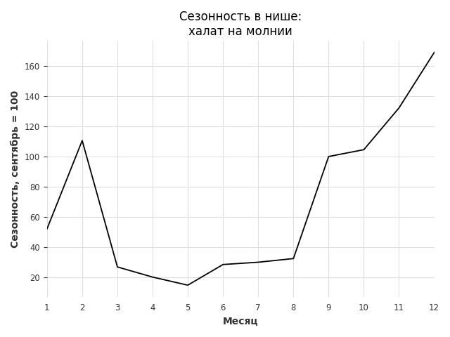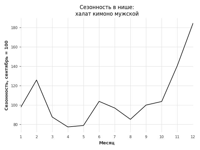 Сезонность в нише сильная. Пик сезонных продаж в нише - декабрь. В ближайшие месяцы можно ожидать сезонного роста продаж до 69%.
