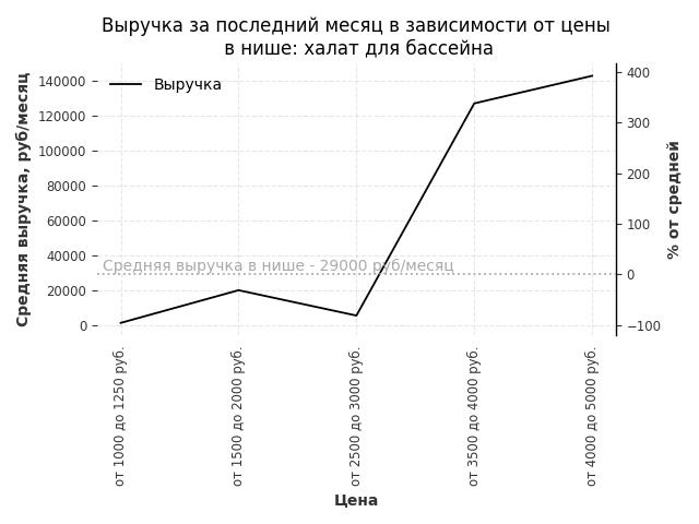 Средняя выручка в нише - 29000 руб./месяц. Максимальная выручка 142700 руб./месяц, на 390% больше среднего в нише, была при цене от 4000 до 5000 руб. руб.