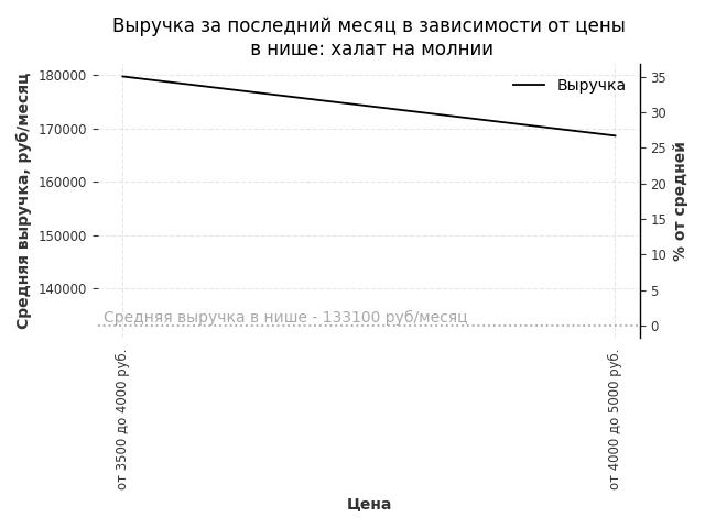 Средняя выручка в нише - 133100 руб./месяц. Максимальная выручка 179700 руб./месяц, на 40% больше среднего в нише, была при цене от 3500 до 4000 руб. руб.
