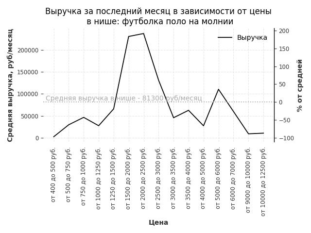 Средняя выручка в нише - 81300 руб./месяц. Максимальная выручка 237300 руб./месяц, на 190% больше среднего в нише, была при цене от 2000 до 2500 руб. руб.