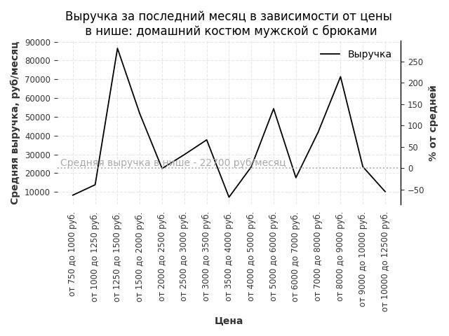 Средняя выручка в нише - 22700 руб./месяц. Максимальная выручка 86500 руб./месяц, на 280% больше среднего в нише, была при цене от 1250 до 1500 руб. руб.