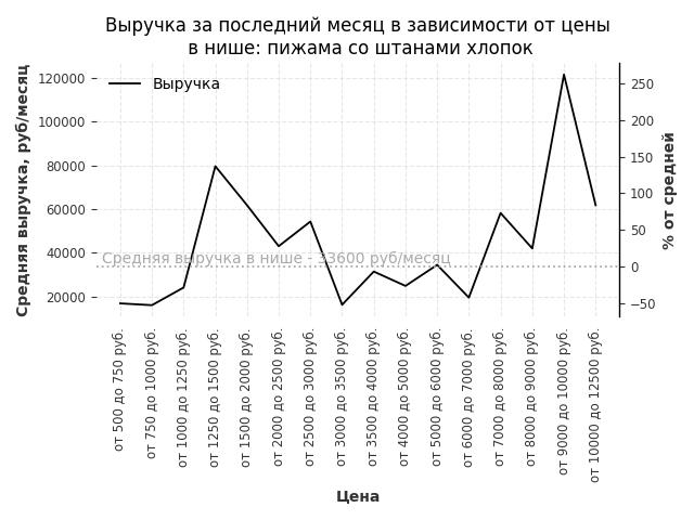 Средняя выручка в нише - 33600 руб./месяц. Максимальная выручка 121600 руб./месяц, на 260% больше среднего в нише, была при цене от 9000 до 10000 руб. руб.