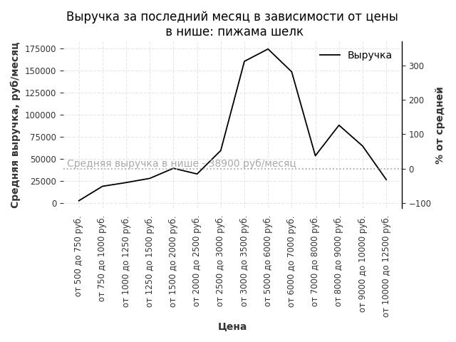 Средняя выручка в нише - 38900 руб./месяц. Максимальная выручка 174000 руб./месяц, на 350% больше среднего в нише, была при цене от 5000 до 6000 руб. руб.