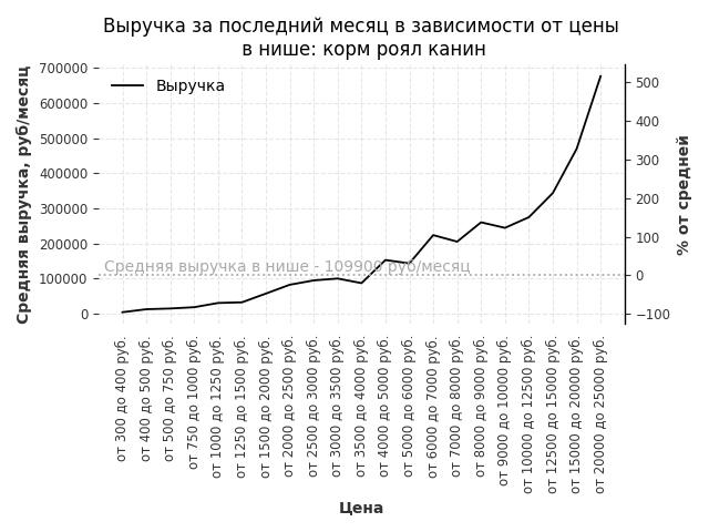 Средняя выручка в нише - 109900 руб./месяц. Максимальная выручка 676900 руб./месяц, на 520% больше среднего в нише, была при цене от 20000 до 25000 руб. руб.