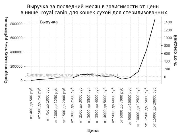 Средняя выручка в нише - 54700 руб./месяц. Максимальная выручка 855200 руб./месяц, на 1460% больше среднего в нише, была при цене от 15000 до 20000 руб. руб.