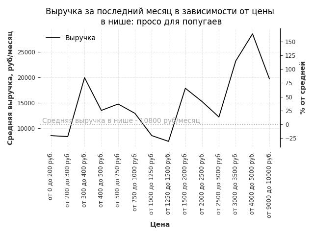 Средняя выручка в нише - 10800 руб./месяц. Максимальная выручка 28500 руб./месяц, на 160% больше среднего в нише, была при цене от 4000 до 5000 руб. руб.