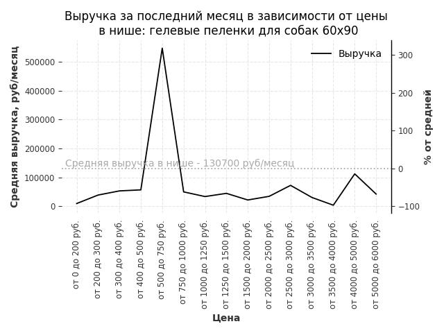Средняя выручка в нише - 17100 руб./месяц. Максимальная выручка 80700 руб./месяц, на 370% больше среднего в нише, была при цене от 1250 до 1500 руб. руб.