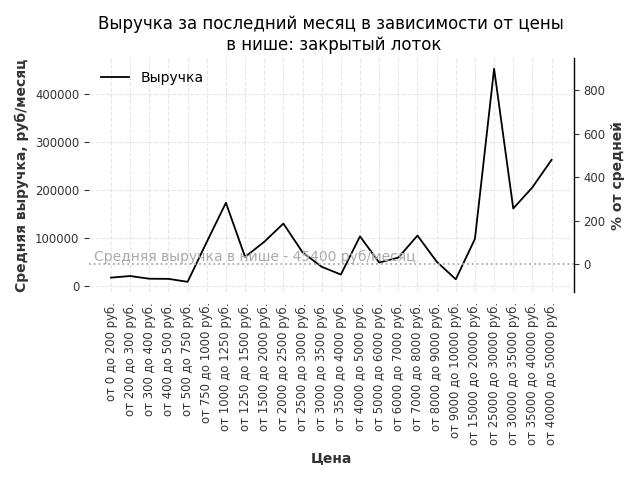 Средняя выручка в нише - 45400 руб./месяц. Максимальная выручка 453100 руб./месяц, на 900% больше среднего в нише, была при цене от 25000 до 30000 руб. руб.