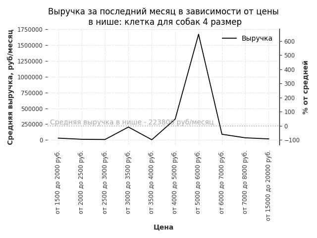 Средняя выручка в нише - 223800 руб./месяц. Максимальная выручка 1672500 руб./месяц, на 650% больше среднего в нише, была при цене от 5000 до 6000 руб. руб.