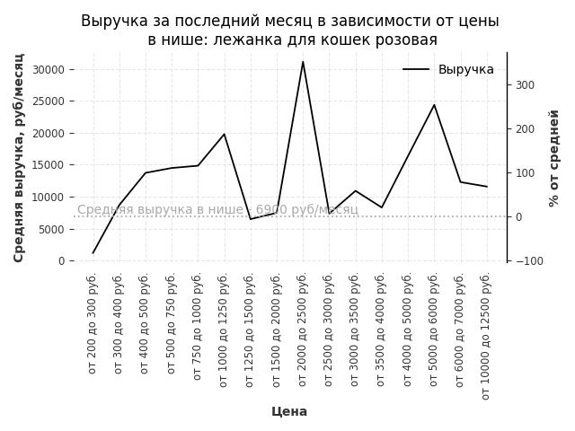 Средняя выручка в нише - 6900 руб./месяц. Максимальная выручка 31100 руб./месяц, на 350% больше среднего в нише, была при цене от 2000 до 2500 руб. руб.