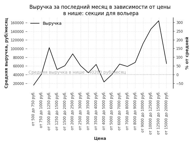 Средняя выручка в нише - 40200 руб./месяц. Максимальная выручка 164400 руб./месяц, на 310% больше среднего в нише, была при цене от 12500 до 15000 руб. руб.