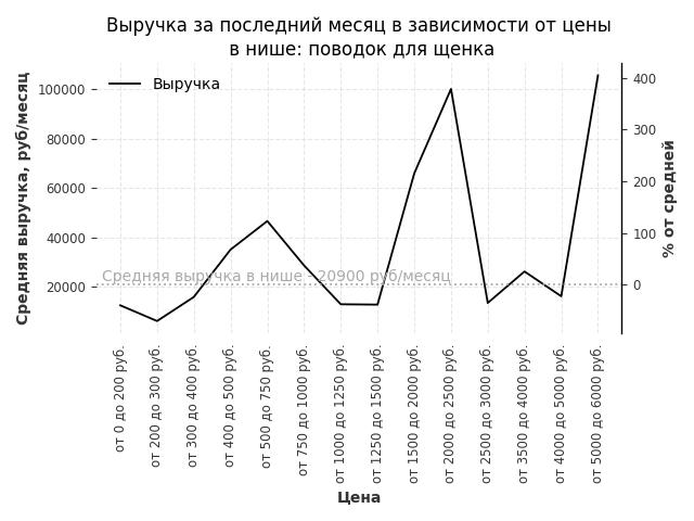 Средняя выручка в нише - 20900 руб./месяц. Максимальная выручка 105500 руб./месяц, на 400% больше среднего в нише, была при цене от 5000 до 6000 руб. руб.