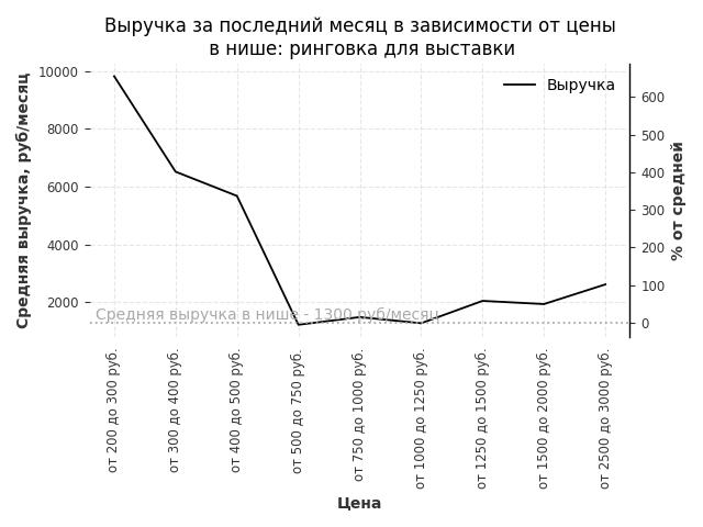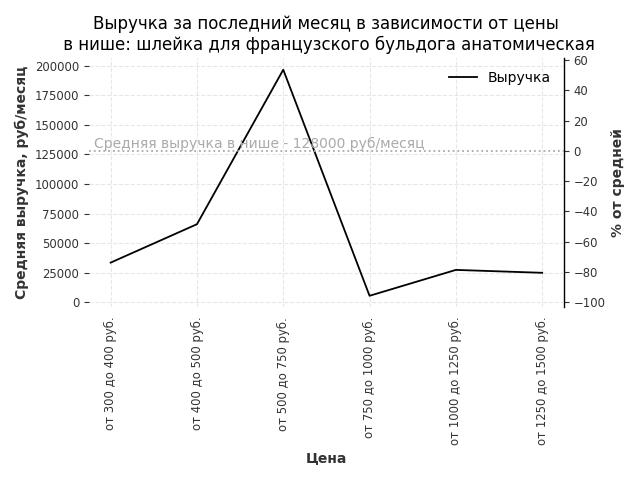Средняя выручка в нише - 128000 руб./месяц. Максимальная выручка 196700 руб./месяц, на 50% больше среднего в нише, была при цене от 500 до 750 руб. руб.