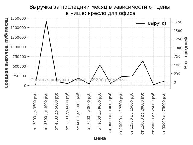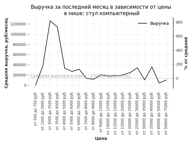 Средняя выручка в нише - 137200 руб./месяц. Максимальная выручка 1260400 руб./месяц, на 820% больше среднего в нише, была при цене от 3000 до 3500 руб. руб.