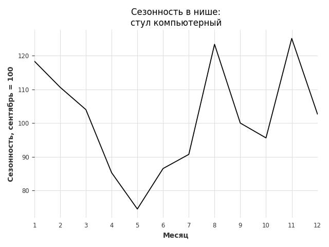 Сезонность в нише слабая. Пик сезонных продаж в нише - ноябрь. В ближайшие месяцы сезонность не будет заметно влиять на продажи.