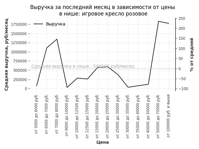 Средняя выручка в нише - 546500 руб./месяц. Максимальная выручка 1826900 руб./месяц, на 230% больше среднего в нише, была при цене от 50000 до 75000 руб. руб.