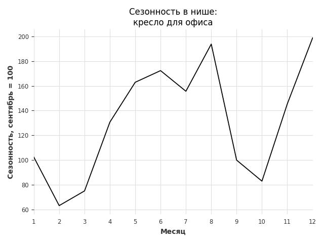 Сезонность в нише средняя. Пик сезонных продаж в нише - декабрь. В ближайшие месяцы можно ожидать сезонного роста продаж до 98%.