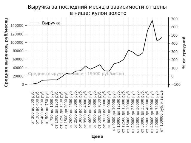 Средняя выручка в нише - 19500 руб./месяц. Максимальная выручка 151800 руб./месяц, на 680% больше среднего в нише, была при цене от 40000 до 50000 руб. руб.