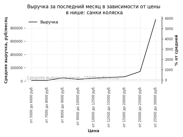 Средняя выручка в нише - 15500 руб./месяц. Максимальная выручка 926400 руб./месяц, на 5880% больше среднего в нише, была при цене от 25000 до 30000 руб. руб.