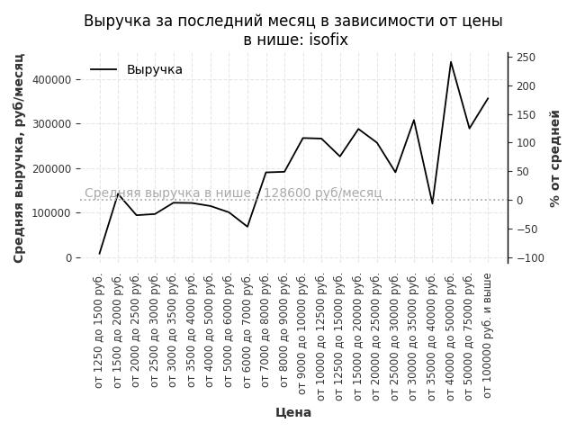 Средняя выручка в нише - 128600 руб./месяц. Максимальная выручка 438100 руб./месяц, на 240% больше среднего в нише, была при цене от 40000 до 50000 руб. руб.