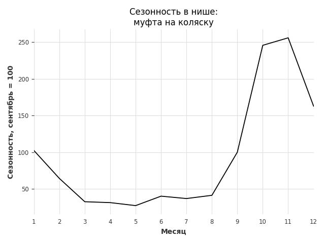 Сезонность в нише сильная. Пик сезонных продаж в нише - октябрь. В ближайшие месяцы можно ожидать сезонного роста продаж до 105%.