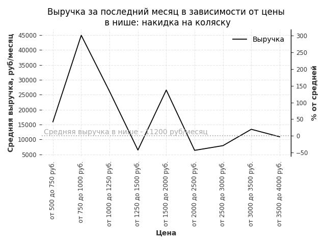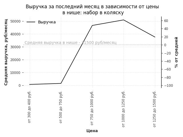 Средняя выручка в нише - 4000 руб./месяц. Максимальная выручка 11400 руб./месяц, на 180% больше среднего в нише, была при цене от 3000 до 3500 руб. руб.