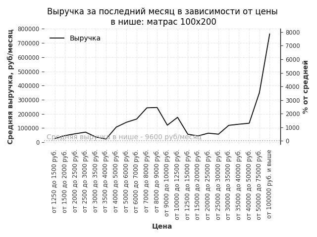 Средняя выручка в нише - 9600 руб./месяц. Максимальная выручка 764000 руб./месяц, на 7860% больше среднего в нише, была при цене от 100000 руб. и выше руб.