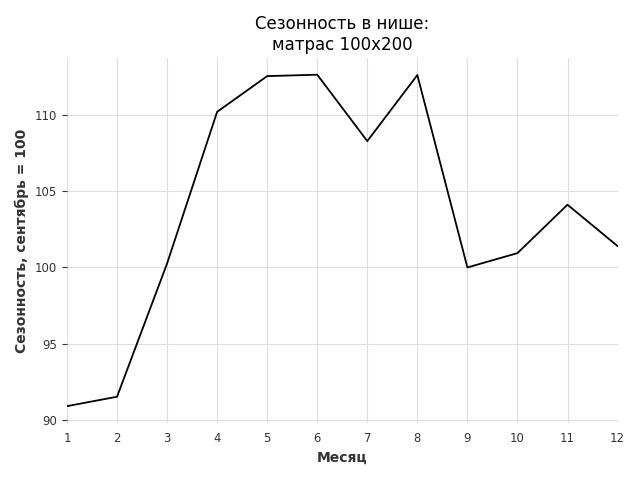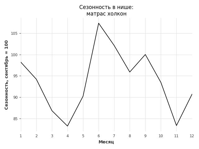 Сезонность в нише слабая. Пик сезонных продаж в нише - июнь. В ближайшие месяцы можно ожидать сезонного спада продаж до 17%.