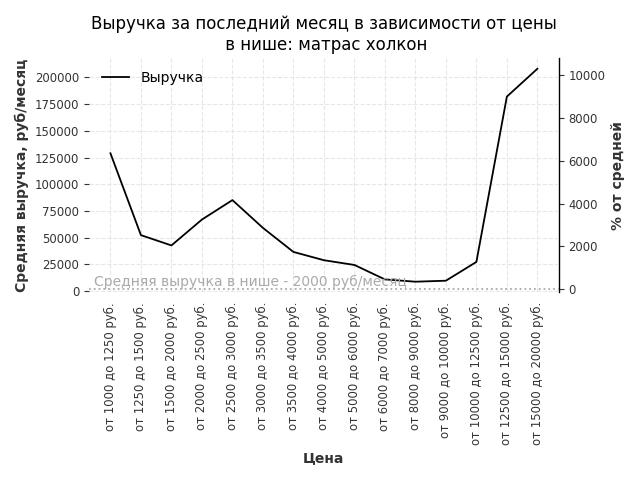 Средняя выручка в нише - 2000 руб./месяц. Максимальная выручка 208000 руб./месяц, на 10300% больше среднего в нише, была при цене от 15000 до 20000 руб. руб.